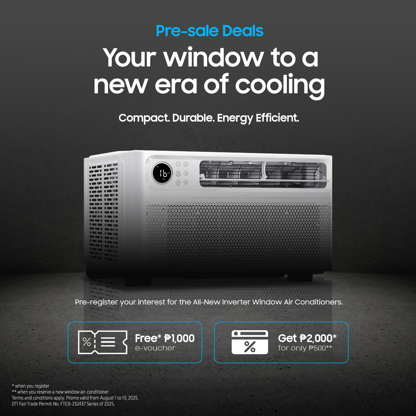 Sign up to express your interest in the Samsung Inverter Window Air Conditioner at https://www.samsung.com/ph/air-conditioners/window-type/ as early as now, and receive a purchase e-voucher worth PHP1,000 for free. You can also purchase e-vouchers worth PHP2,000 for only PHP500 when you reserve an Inverter Window Air Conditioner now until August 10, 2025.