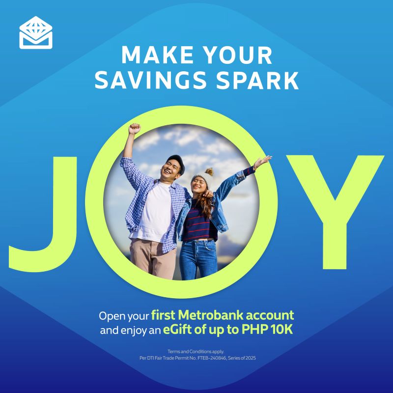Because if you think about it, saving isn’t just about numbers on your bank account— it’s about the life moments you’re working toward. Now, Metrobank is giving you an extra reason to feel good about it with a guaranteed eGift of up to PHP10,000 just for growing your money with the Spark Joy Promo.